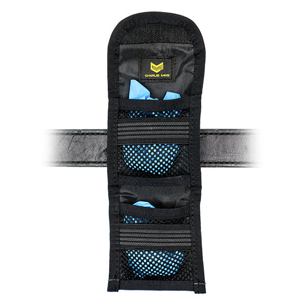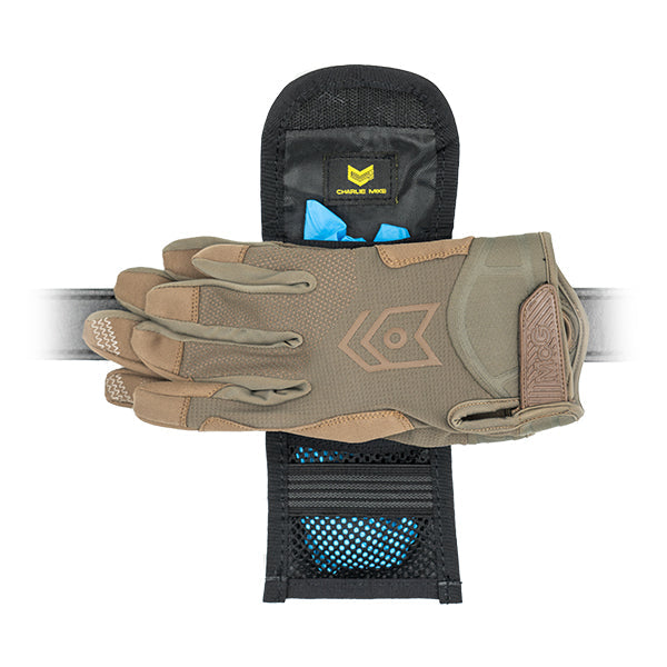 Die TACTICAL GLOVE POUCH von CHARLIE MIKE fasst Nitril- und Schutzhandschuhe gleichzeitig. In den beiden eingearbeiteten Mesh-Täschchen können je ein paar Nitril-Handschuhe verstaut werden und dank den beiden Rubber-Einsätzen besteht auch keine Gefahr, dass die Einsatzhandschuhe seitlich herausrutschen.