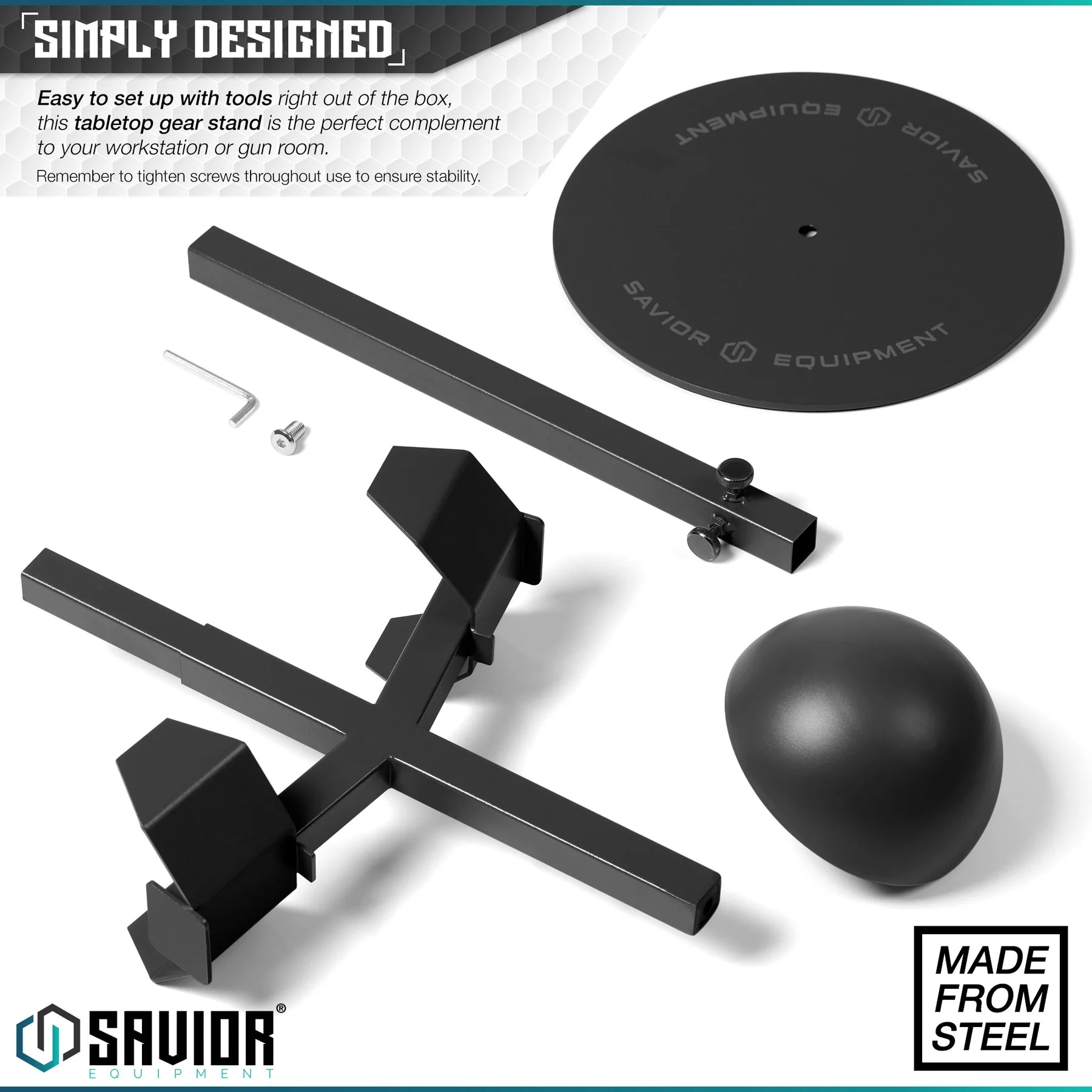 Das Rack besteht aus hochwertigem Stahl mit einer widerstandsfähigen Pulverbeschichtung, um deine Ausrüstung sicher und geschützt aufzubewahren. Es hält einem Gewicht von bis zu 45 kg (100 lbs) stand – ideal für schwere Westen und Helme.