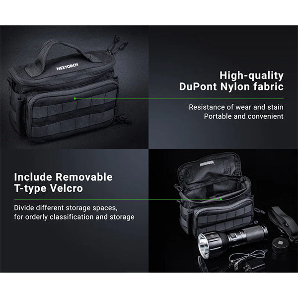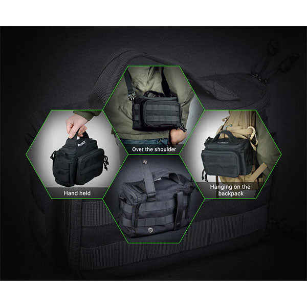 - strapazierfähige Tragetasche, die schnell an Einsatzwesten, Rucksäcken oder am Gürtel befestigt werden kann