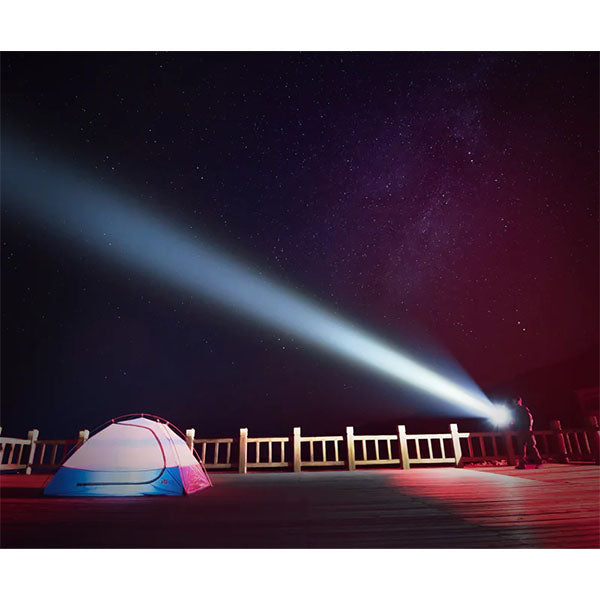 Der SAINT TORCH 11 Suchscheinwerfer von NEXTORCH überzeugt mit einer Leuchtweite von 600 Meter und 6 Leuchtmodi. Die leistungsstarken 4 Akkus mit je 2’600mAh garantieren eine Laufzeit von bis zu 110 Stunden und können dank integriertem USB-C-Anschluss sogar als Powerbank z.B. für Smartphones eingesetzt werden. Über den aktuellen Ladezustand informieren 4 blaue LEDs, die in der Seite eingelassen sind.