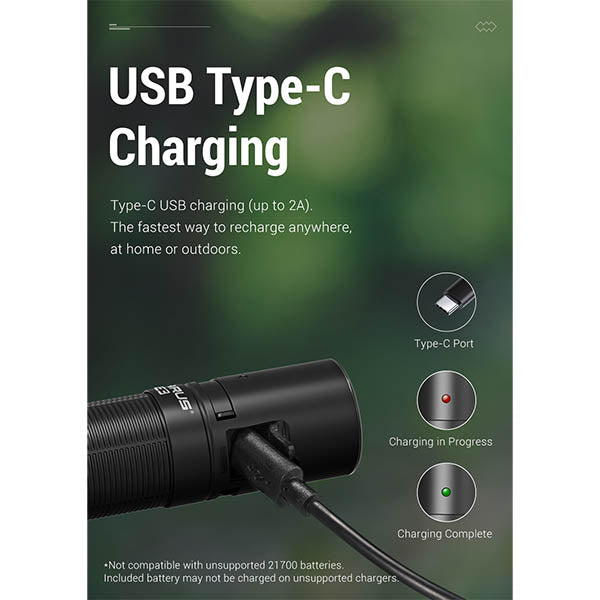 Lieferumfang: E3, Holster, 18650, 5000mAh Akku, Lanyard, USB-Ladekabel, Ersatzdichtung, Bedienungsanleitumg.