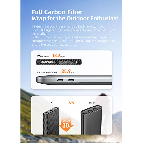 Die neue, wasserdichte K5 Powerbank von KLARUS ist aus Carbon-Faser gefertigt und wiegt nur gerade 157 g. Dank dem IP68 Standard ist sie auch vor den rauesten Elementen und Wasser geschützt. Mit einer Kapazität von 10.000mAh können kleinere Geräte wie Telefone, Uhren Airpods etc. aufladen werden. Die K5 verfügt über USB-C- und USB-A-Anschlüsse und der LED-Bildschirm informiert dich jederzeit über die verbleibende Energie.