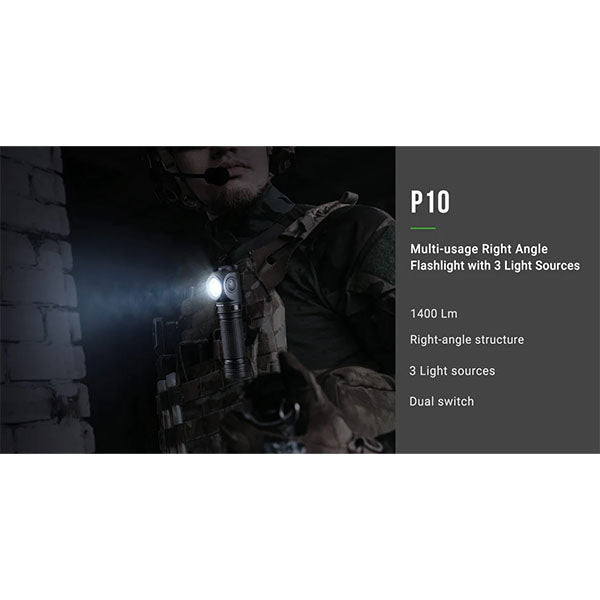 Die taktische Winkeltaschenlampe P10 von NEXTORCH ist eine robuste und absolut wasserdichte LED-Lampe mit leistungsstarker Technik. Das Gehäuse der P10 Winkel-LED-Lampe ist aus fast unzerstörbarem Flugzeug-Aluminium.