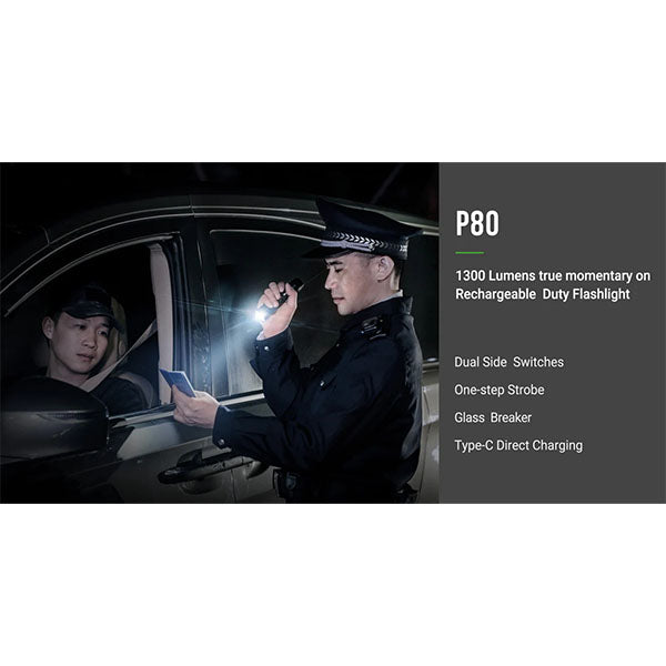 Dank dem starken Akku hält die P80 sogar in der höchsten Leuchtstufe von 1’300 Lumen volle 2 Stunden durch! Vorne an der Linse befindet sich für Notsituationen ein Glasbrecher, der aus praktisch unverwüstlichem Nano-Keramik gefertigt ist. Das aus gehärtetem Aluminium gefertigte Gehäuse der P80 MAX ist absolut wasserdicht und übersteht Stürze aus 2 Meter Höhe unbeschadet.