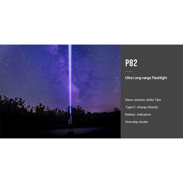 Die P82 wurde speziell für Einsatzkräfte und Behörden konzipiert und weist ein extrem leichtes Bedienkonzept auf. Das aus gehärtetem Aluminium gefertigte Gehäuse ist absolut stossfest und übersteht Stürze aus 1 Meter Höhe ohne Schaden. Dank dem starken Akku erreicht die P82 eine Leuchtweite von sagenhaften 1'100 Metern. Der zusätzliche Strobo-Modus dient der Abwehr in heiklen Situationen und zeigt auch Wirkung bei Personen, die unter der Einwirkung von Alkohol oder Betäubungsmitteln stehen.