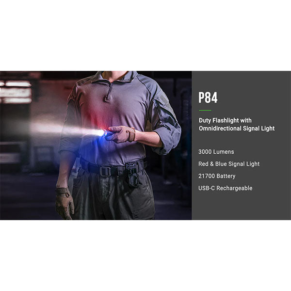 Die P84 von NEXTORCH ist eine LED-Taschenlampe mit Signal-Rundumlicht, Rettungs-Glasbrecher und einem extra leistungsstarken 21700 Li-on Akku. Mit beeindruckenden 3000 ANSI-Lumen Leuchtstärke bietet die P84 eine hervorragende Leistung. Die einfache und selbsterklärende einhändige Bedienung ermöglicht das Einschalten, Dimmen und Ausschalten alles über einen Schalter. Der hochwertige Reflektor der P84 sorgt für den perfekten Lichtstrahl – stark gebündelt für optimale Fernsicht und breit und blendfrei für eine ideale Helligkeit in der Umgebung.