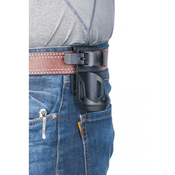 So kann man vor sich alles perfekt ausleuchten und hat trotzdem die Hände jederzeit frei. Ein weiterer Vorteil des Holsters ist, dass es krawalltauglich ist - eine im Holster gesicherte Taschenlampe kann von Unbefugten nicht entnommen werden. Das Entsichern und Entnehmen der Taschenlampe erfolgt mit nur einer Hand. Der Entsicherungshebel ist ergonomisch so optimiert, dass die Einhandbedienung auch ohne Übung garantiert sehr schnell gelingt. Das V5 Holster eignet sich für alle Gürtel bis 55mm Breite.